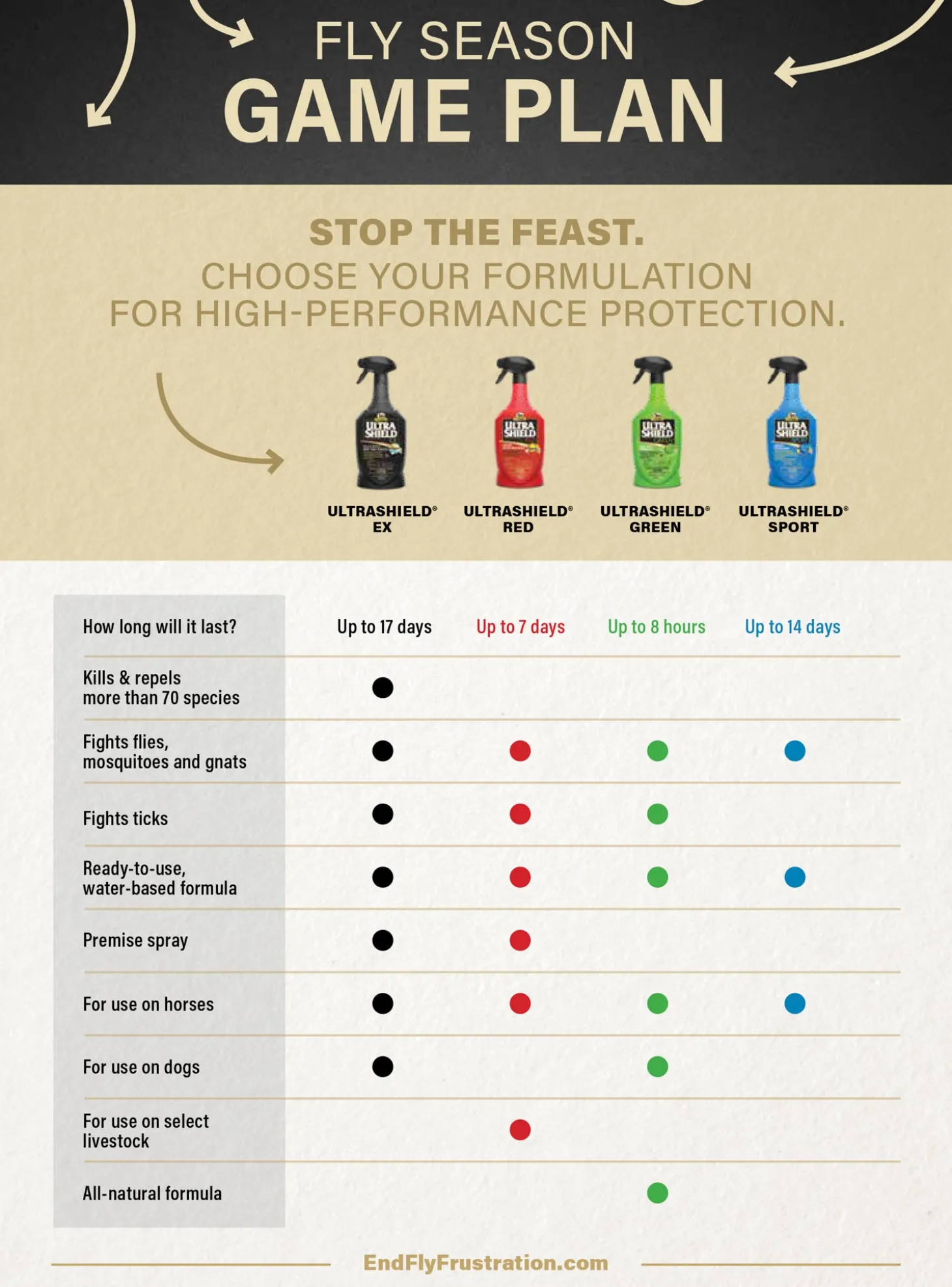 Absorbine® UltraShield® Green Natural Fly Repellent is a unique, eco-friendly formula that controls biting flies, mosquitoes, gnats and ticks for up to eight hours. Made for use on horses, ponies, foals and dogs, this fly spray contains seven essential oils that are known for their repellent qualities. The fresh botanical scent makes it pleasant to use, and it leaves coats shiny.