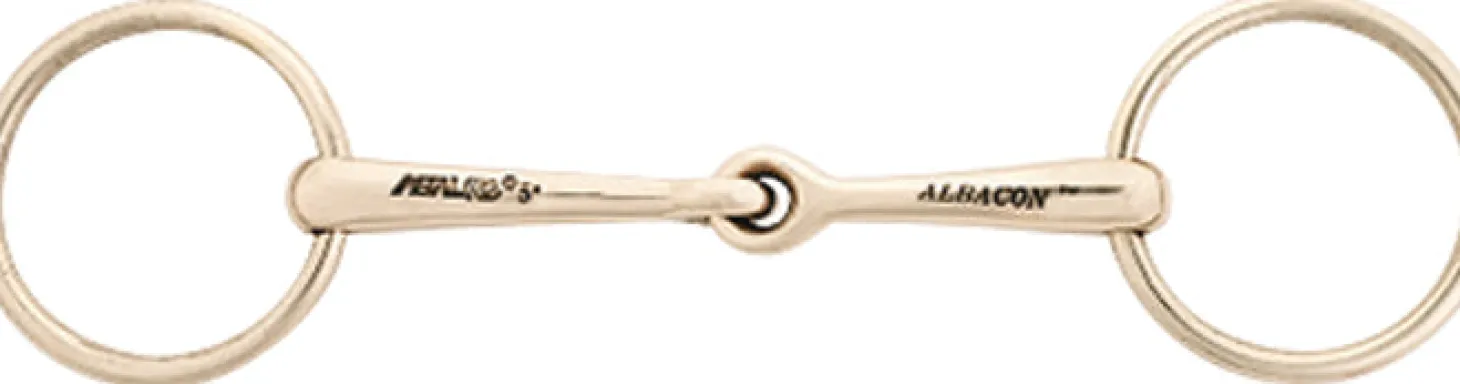 The AlBaCon™ Bradoon Bit is made from copper enhanced German Silver to help stimulate salivation and encourage bit acceptance. The high copper formula also helps prevent dry mouth, yet retains the appearance and durability of German Silver. 13mm mouthpiece with 55mm rings.