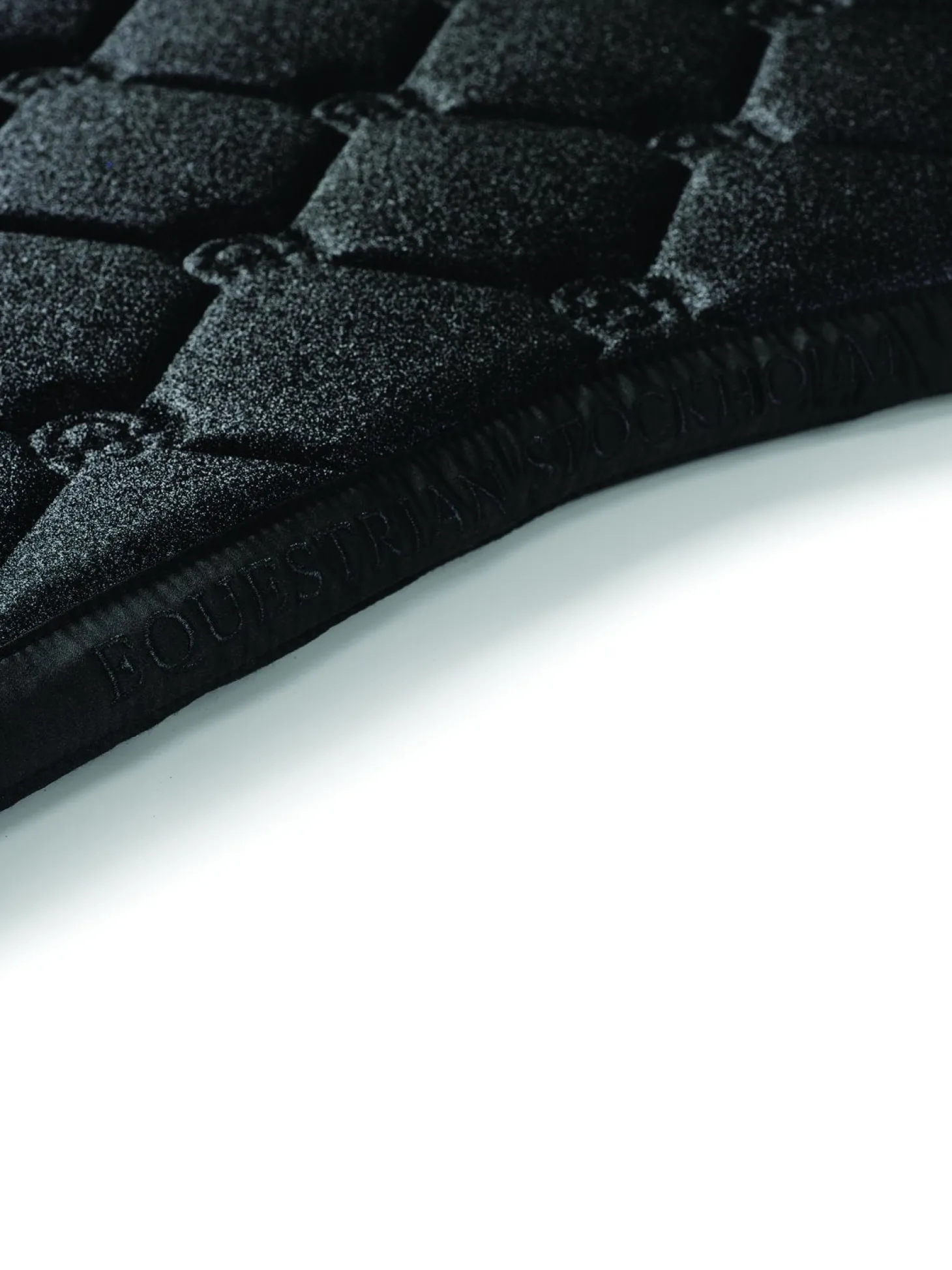 The Equestrian Stockholm Glimmer Jump Saddle Pad will keep your horse comfortable and you looking stylish all day long. The material is treated with High IQ cool comfort which gives the saddle pad quick dry and moisture wicking abilities to keep your horse dry and fresh longer. A durable protection patch under the hook-and-loop strap by the girth protects the area where there is most wear and tear. Decorated with Equestrian Stockholm badge. Black metallic logo tape on top binding.