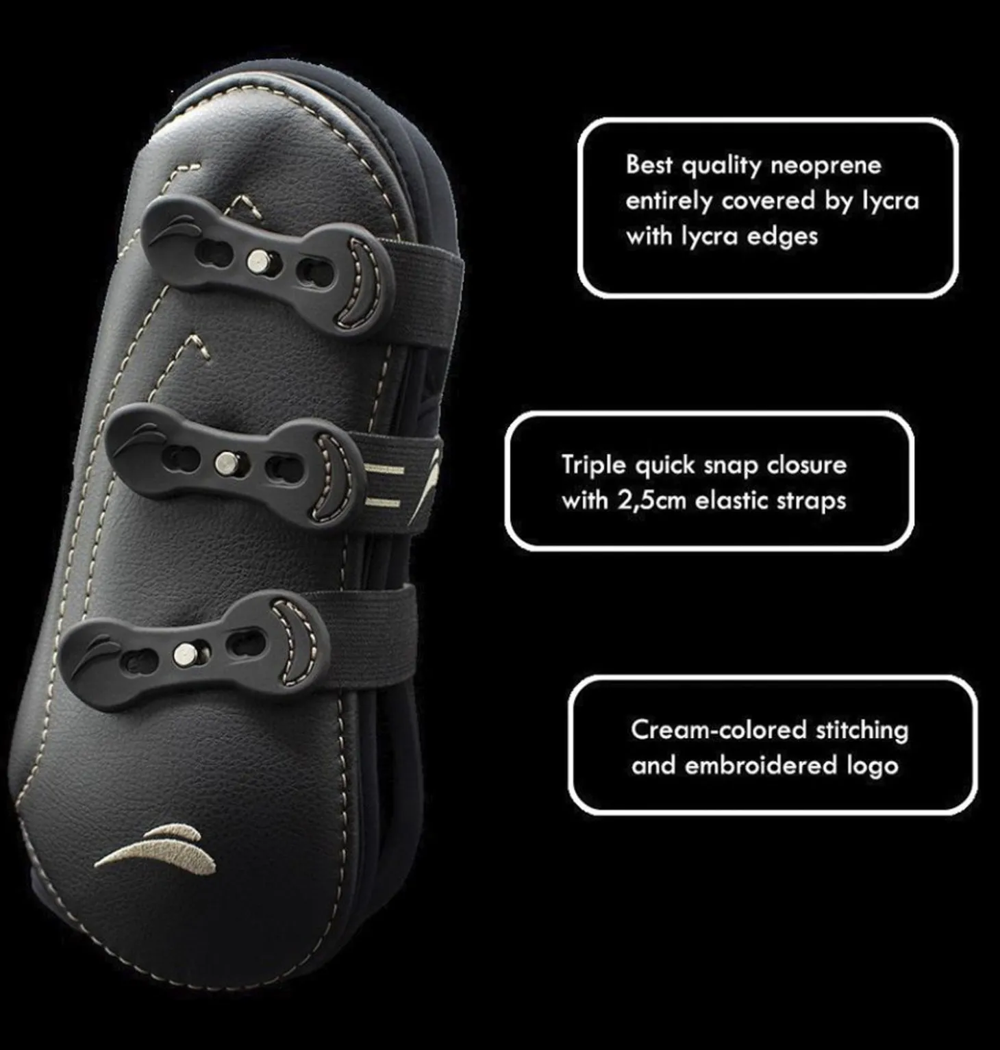 eQuick Glam Front Boots offer superior protection with three shock-absorbing layers, a high-quality leather outer and a neoprene lining. Soft Lycra® covers and edges the neoprene. Elasticized straps ensure a snug fit. Pair.