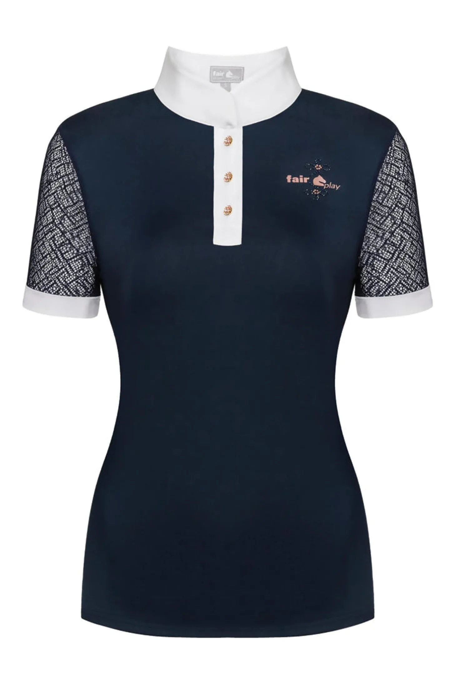 Add the Fair Play® Cecile RoseGold Short Sleeve Show Shirt to your competition outfit for chic and feminine style. Moisture-wicking, breathable and elastic fabric delivers all-day comfort. Lace inserts allow increased airflow. Decorative crystal application adorns the front and back.