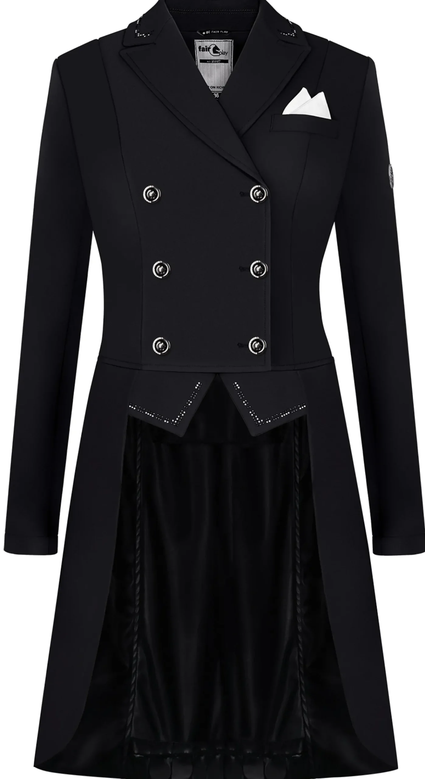 The elegant Fair Play® Nadine Shadbelly is beautifully tailored in elastic COMFINAT-tech™ fabric. This dressage tailcoat is highly breathable, extremely elastic and feels pleasant to the touch. The material provides long-lasting UV protection and resists wrinkles. Made with concern for the environment, it has innovative fibers derived from grain, unlike other polyester yarns. A mesh lining in the body promotes air circulation, while the tails are weighted evenly and lined with synthetic leather.