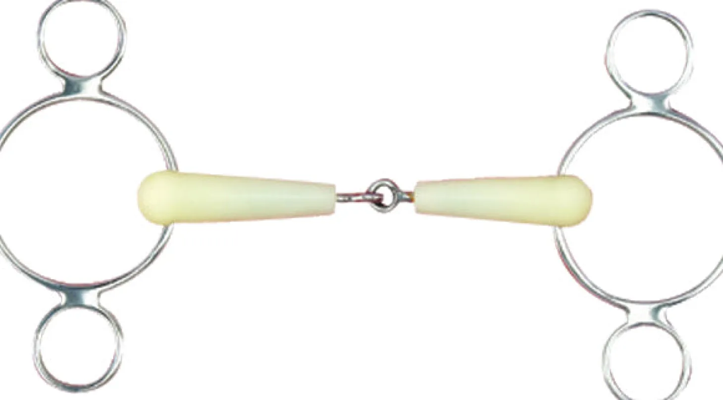 This Happy Mouth Bits® 2-ring Elevator Bit is covered with a soft, flexible, yet extremely durable, apple-scented plastic which encourages acceptance and softness. The mouthpiece core and rings are stainless steel. Allows adjustability in function depending on which ring the rein is attached to.