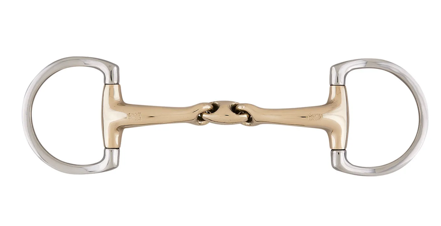 Distinctively unique, this metal is a propriety blend of copper, zinc and manganese. A reduced copper content allows some oxidation to occur, but the addition of manganese regulates and slows oxidation which in turn slows discoloration. Manganese is also an important micronutrient for horses, as a crucial component and activator of enzymes. All Sensogan bits are marked with a black ring at the cheeks.