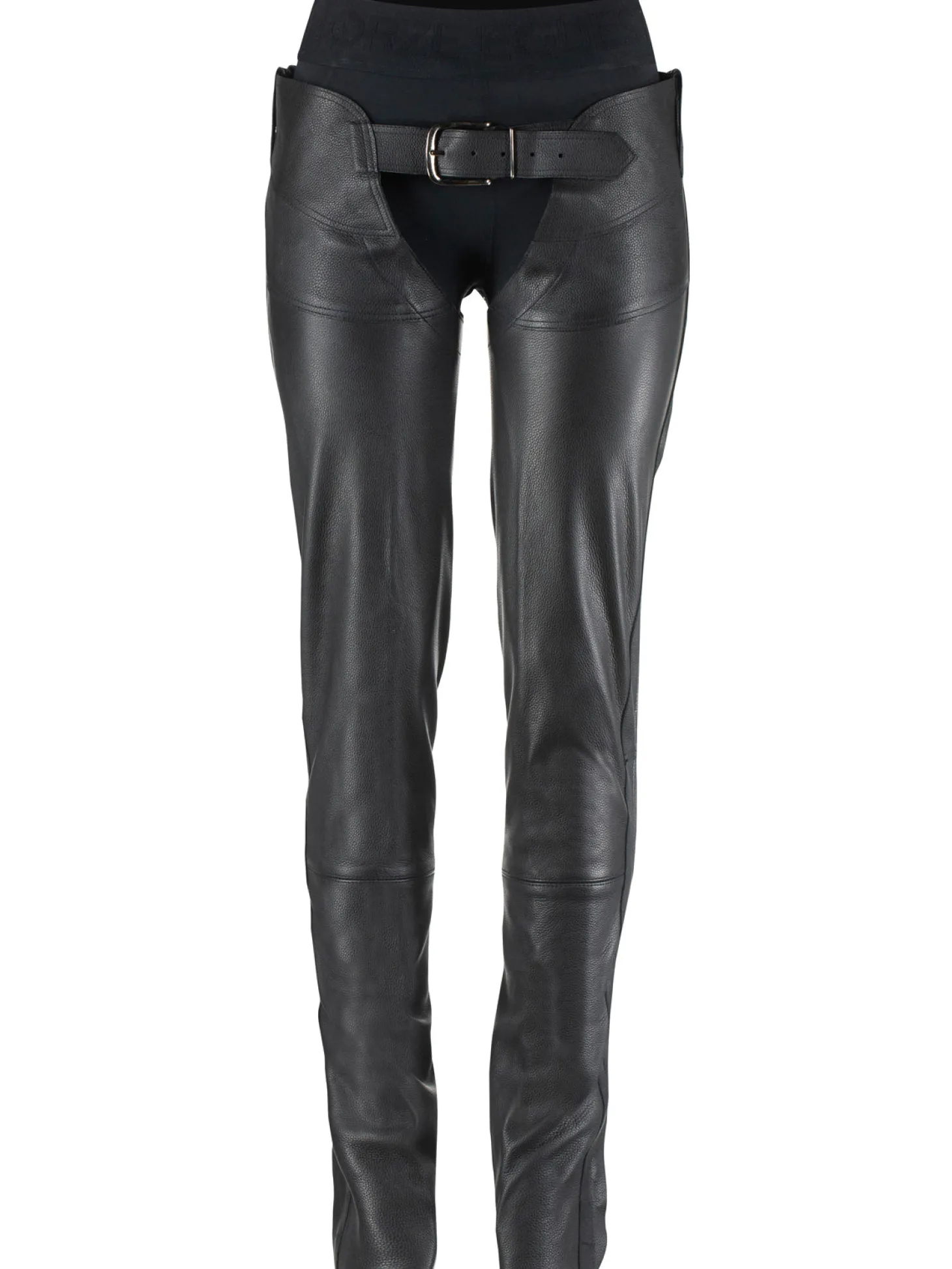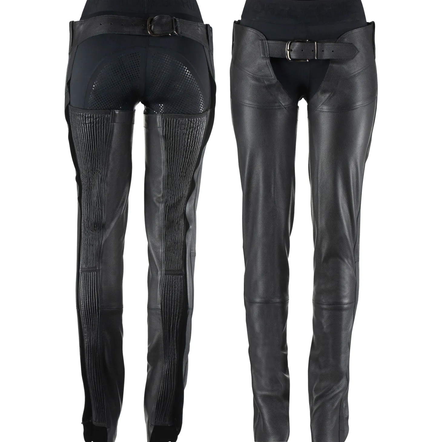Full chaps also reduce wear and tear on your clothes washing machine by keeping dirt and mud off breeches. Because these leather chaps have elastic panels, they get more comfortable with every ride. Adjustable at front and back. Hems can be cut to suitable lengths at the bar-tack stitches. Silver-finish hardware.