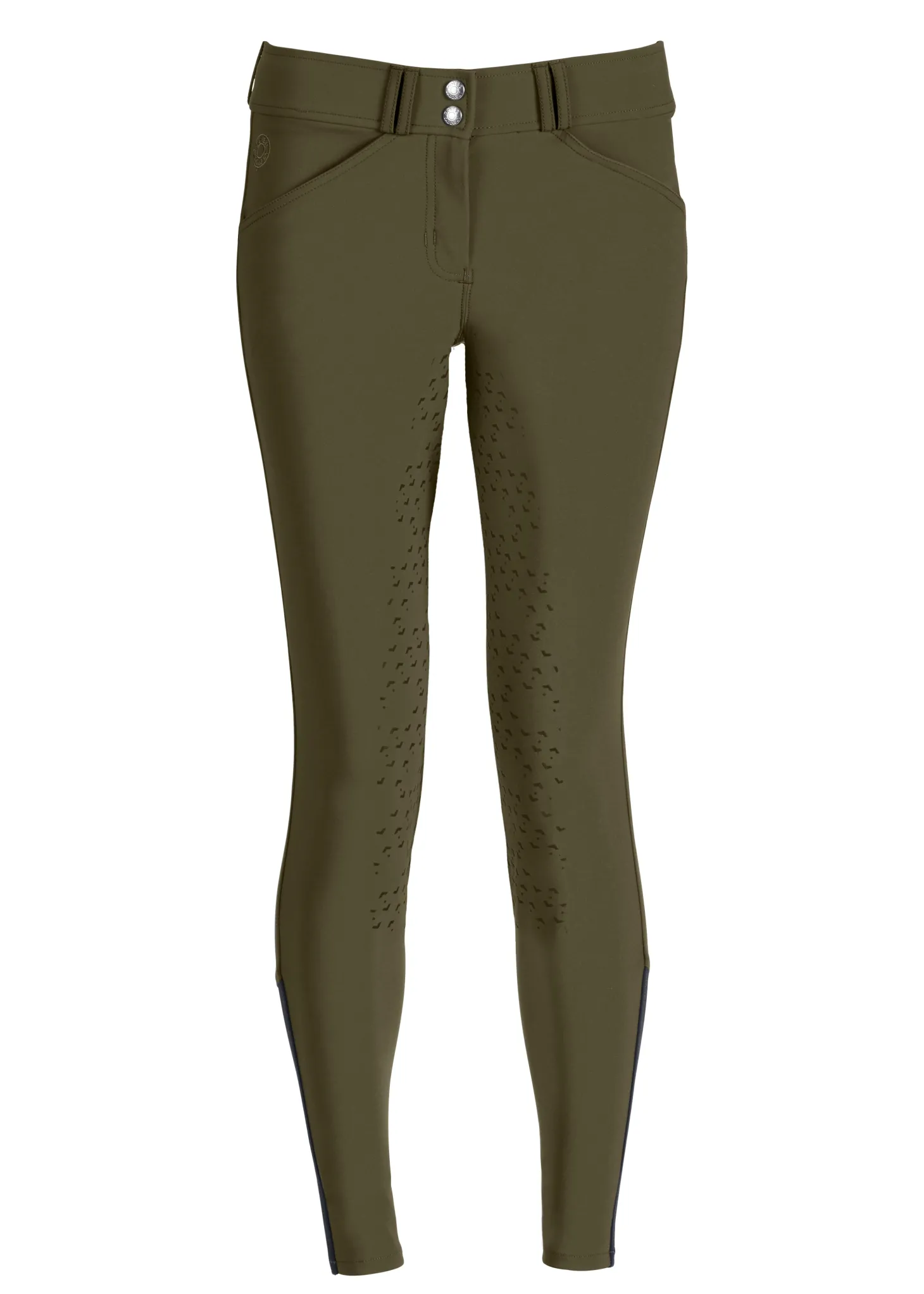 Single-layer, high-stretch calf panels provide a custom fit, eliminate bulk inside boots and allow easy on/off. Front slash pockets and functional back pockets are made of low-profile stretch material for a no-show appearance on the outside and enhanced comfort on the inside. The silicone print full seat features a stylish equestrian design that provides flexible grip.