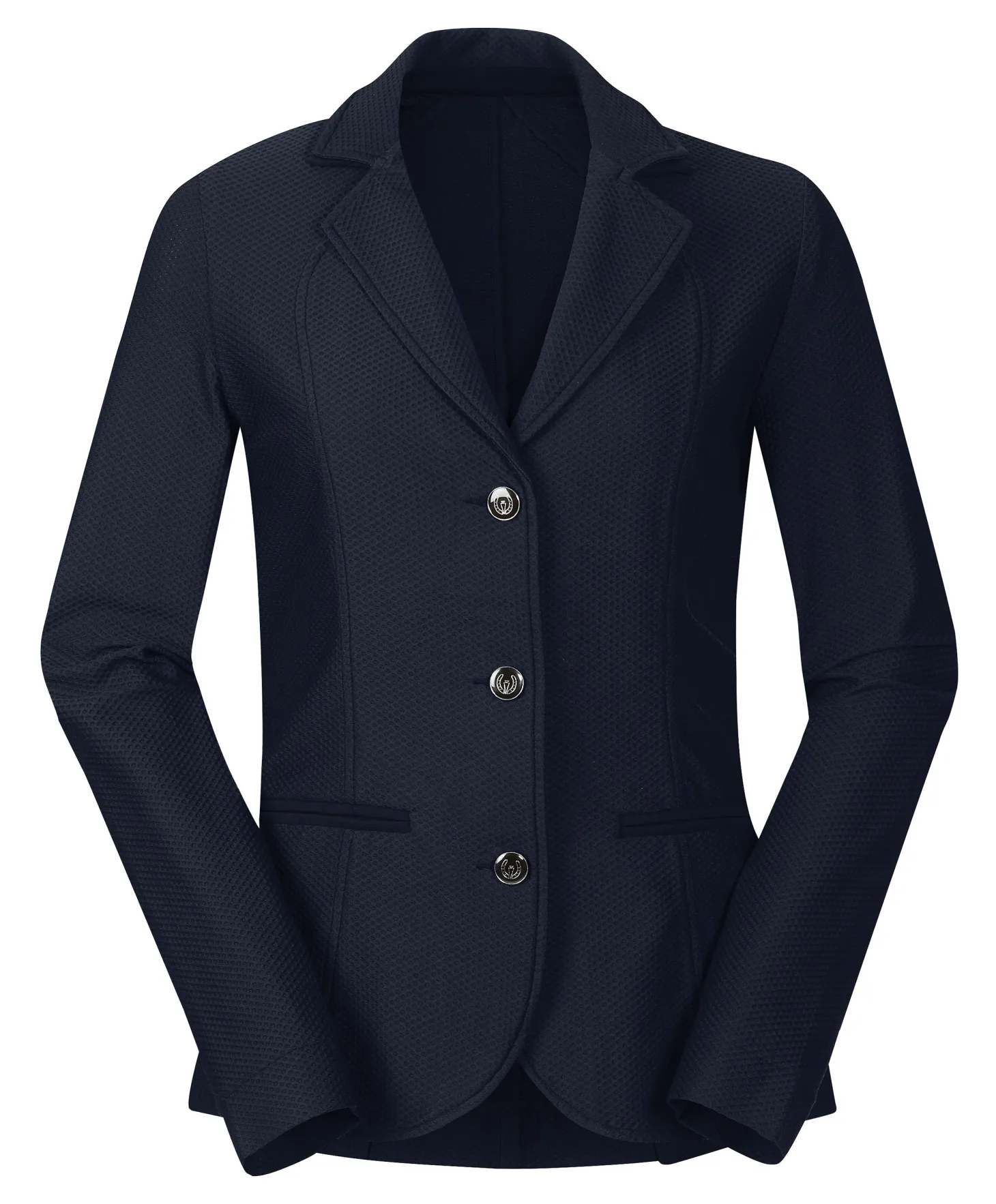 Classic features include eyelets for number strings, hidden front zip under traditional three-button front closure, faux front pockets and a double-vent back ensure that young riders are show-ring ready. Includes two sets of exchangeable buttons. No trips to the dry cleaners necessary—this coat is machine washable and quick drying.