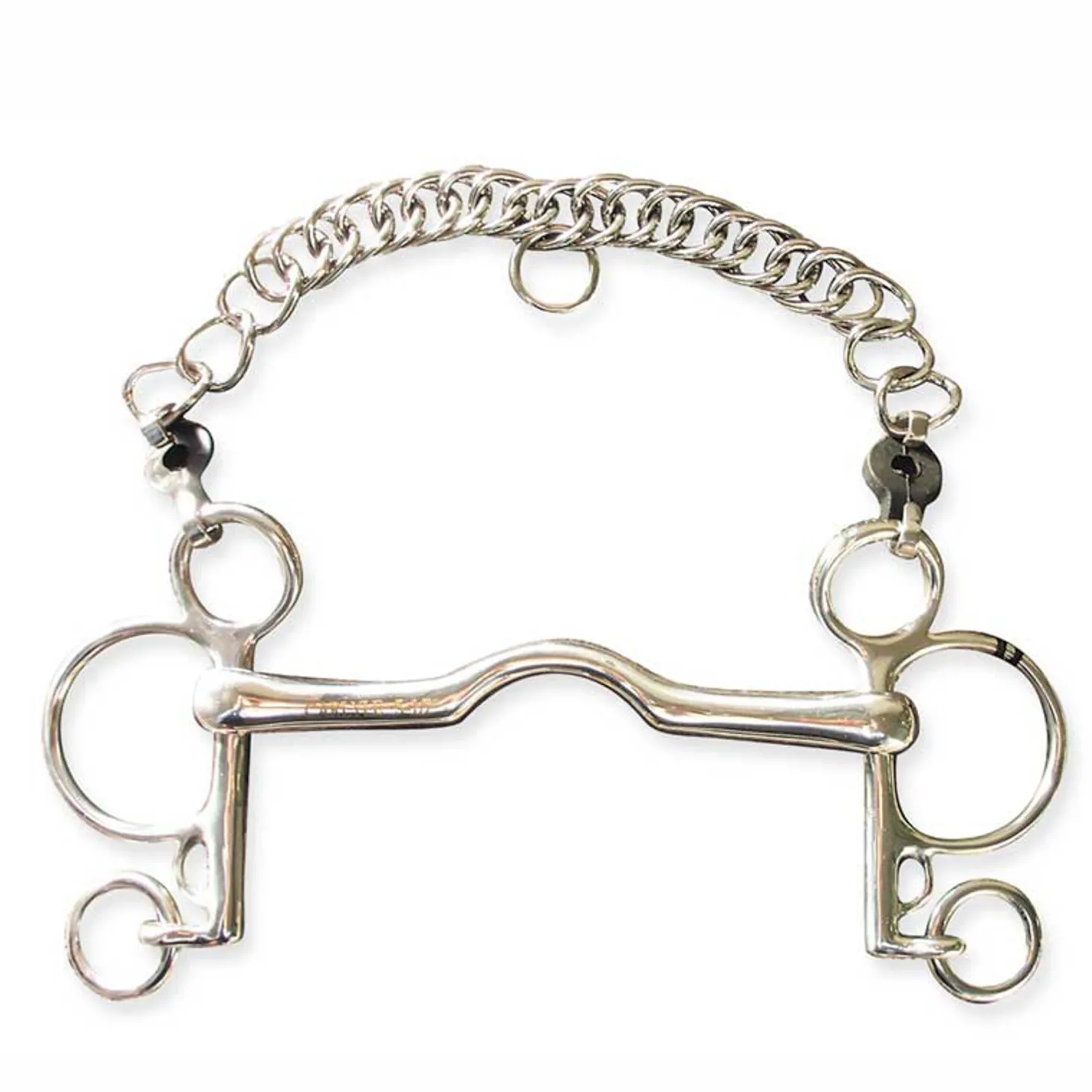 This Metalab Low Port Pelham is a Level 4 bit made of stainless steel. Mouthpiece is 15mm diameter. Cheeks are 4″. Curb chain and hooks included.