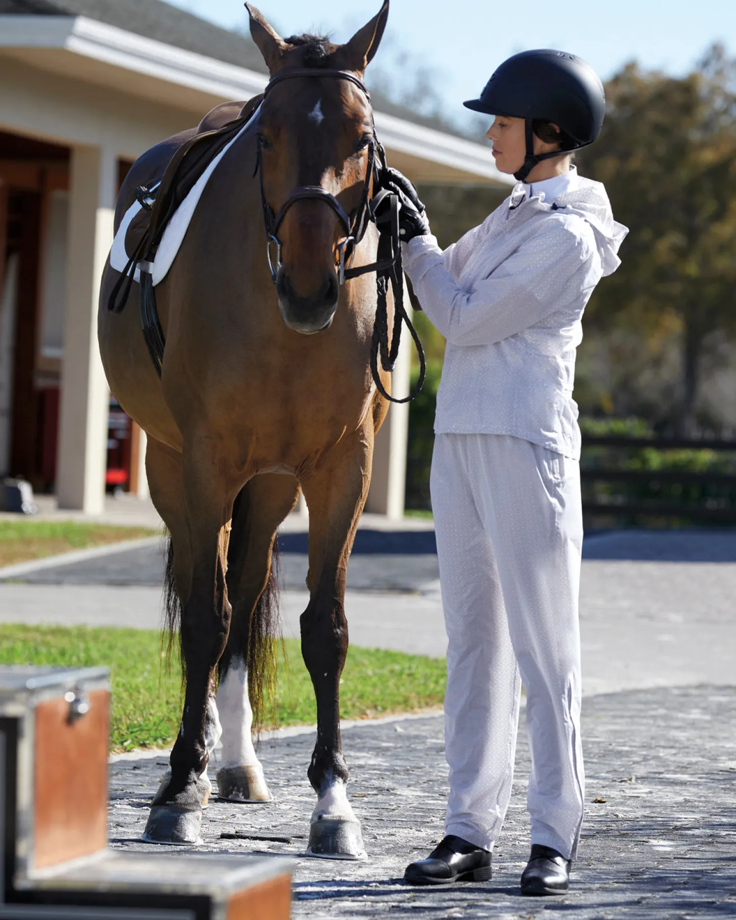 The Stride™ Hilo H2O Jacket with waterproof, seam-sealed construction is so lightweight and stretchy, you’ll barely know you’re wearing it. Perfect for hot, rainy days, it is also a great choice for keeping clothes dry and clean when you bathe or clip your horse. For the ultimate convenience, the Hilo zips into its own pocket and secures with a belt around your waist as soon as you don’t need it.