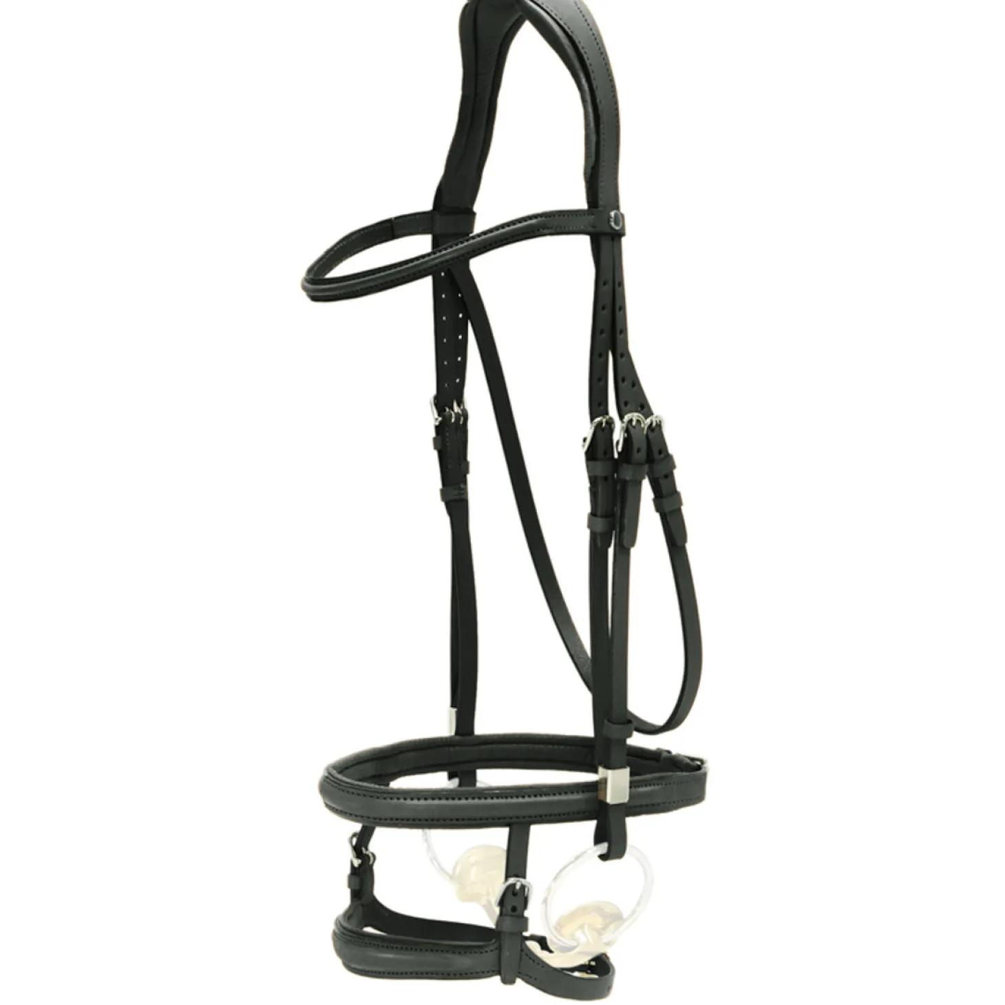 The tandem noseband combines the effect of the Hanoverian and English nosebands to give the horse more frame and distribute pressure. Distance between nosebands allows for a precise adjustment.