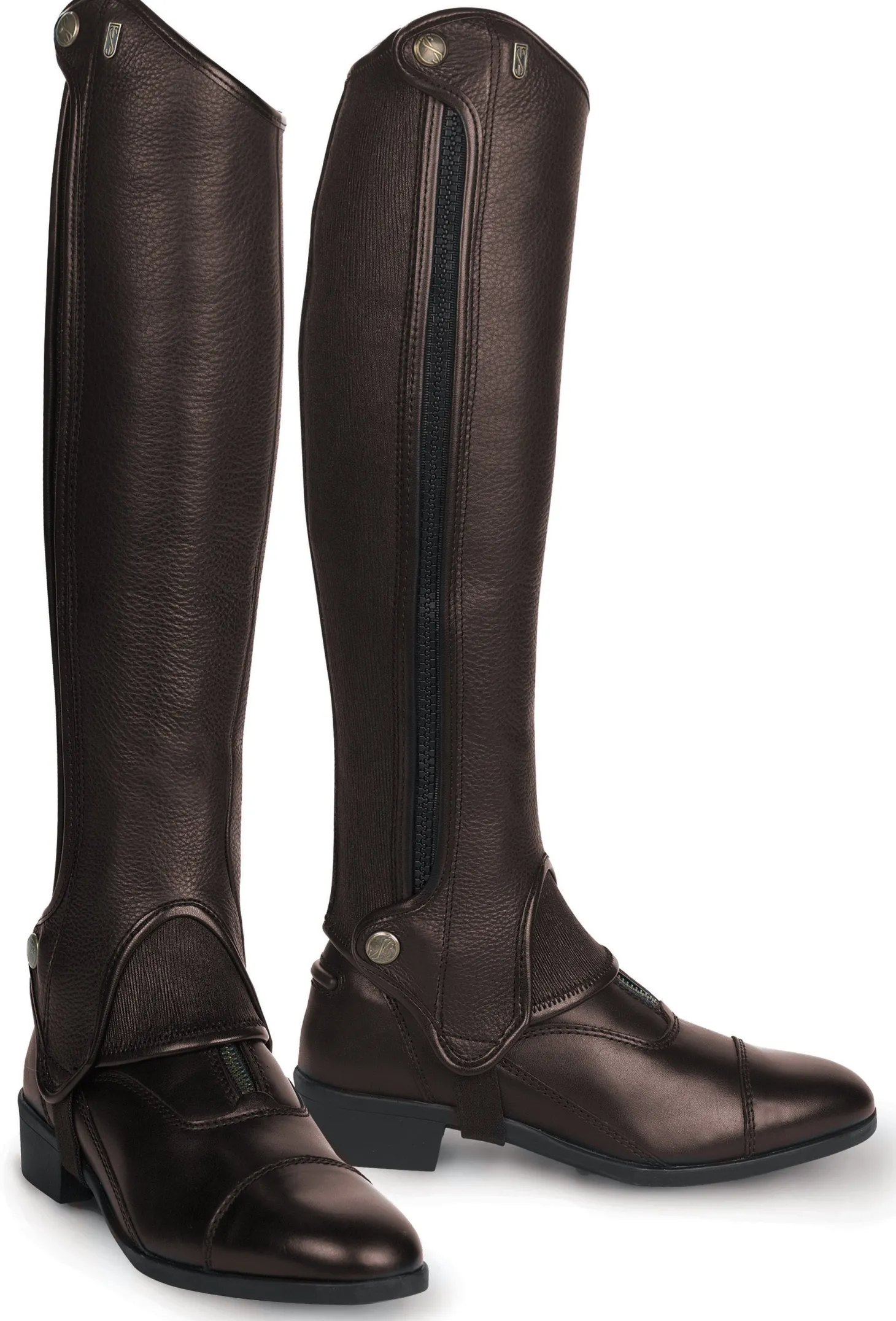 Tredstep™ Deluxe Half Chaps feature a stretch leather panel for a close contact fit. A popular style, these half chaps are made of full-grain leather. A stretch leather skirt over the instep adds comfort. Outside YKK® heavy-duty zipper closes from the top down. Snap tabs at top and bottom.