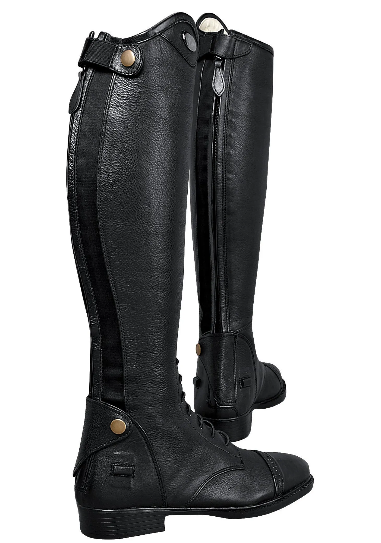 The TuffRider® Ladies’ Belmont Field Boot in soft and supple leather feels great from the first wearing. Traditionally styled with a punched toe cap, this field boot has elastic speed laces and two side spur rests. Full-length rear zipper is bordered by a full elastic panel for the feel of a custom fit. Snap keeper at knee and ankle. Logo plaque on moderate Spanish top. Fully lined and fitted with a comfortable footbed.