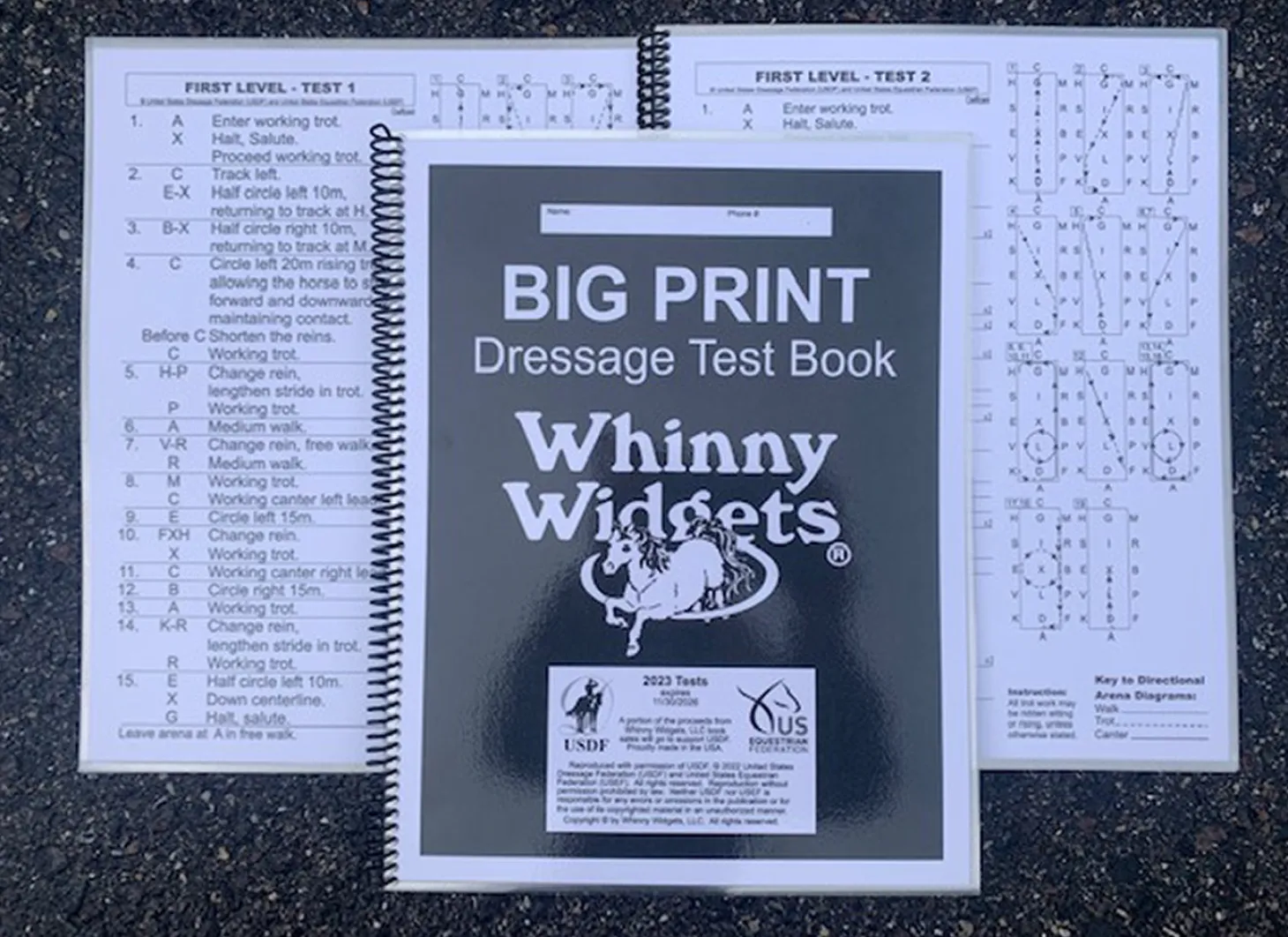 PRODUCT DESCRIPTION: Whinny Widgets® Big Print Dressage Test Book (2023-2027)