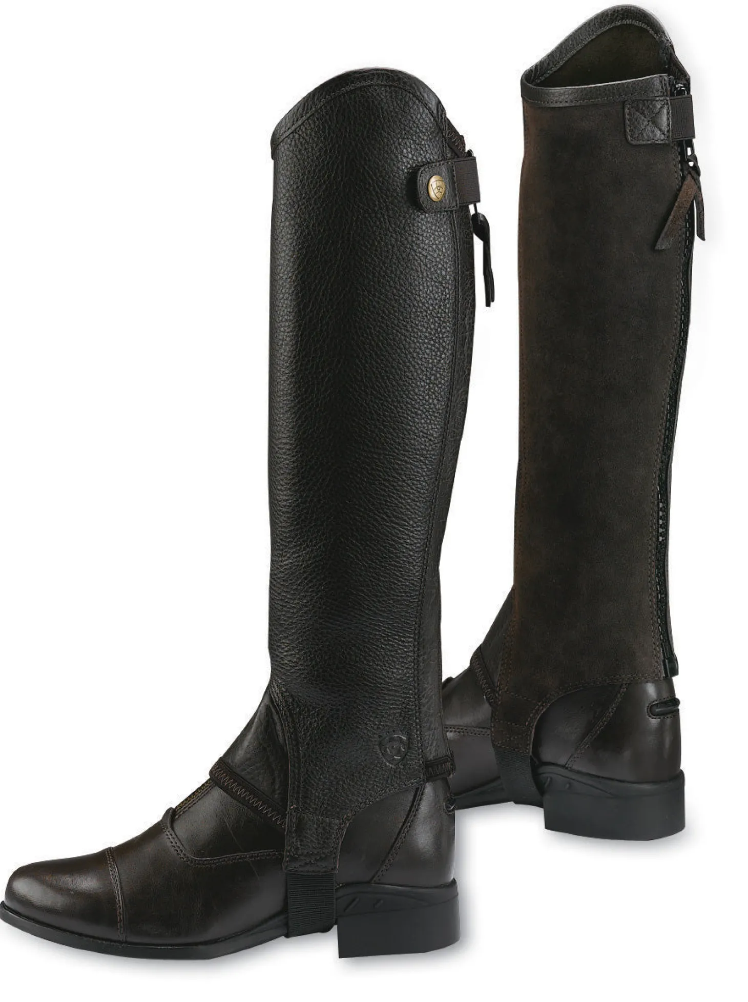 Ariat® Concord Half Chaps offer an elegant, elongated look with an unlined, full-grain leather outer panel. Suede inner panel, stretch skirt over instep and Spanish topline. Back zipper and full-length elastic panel for fit. Zips from the bottom up.