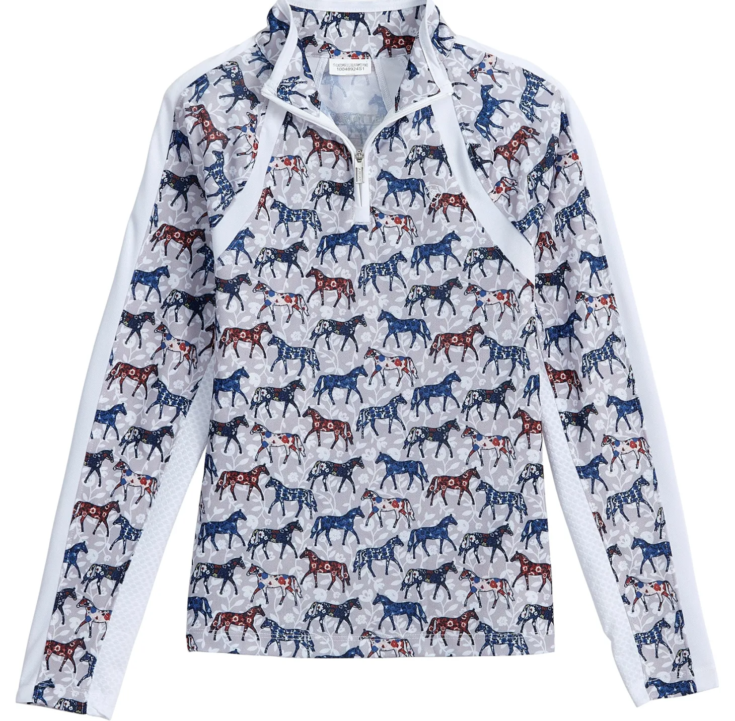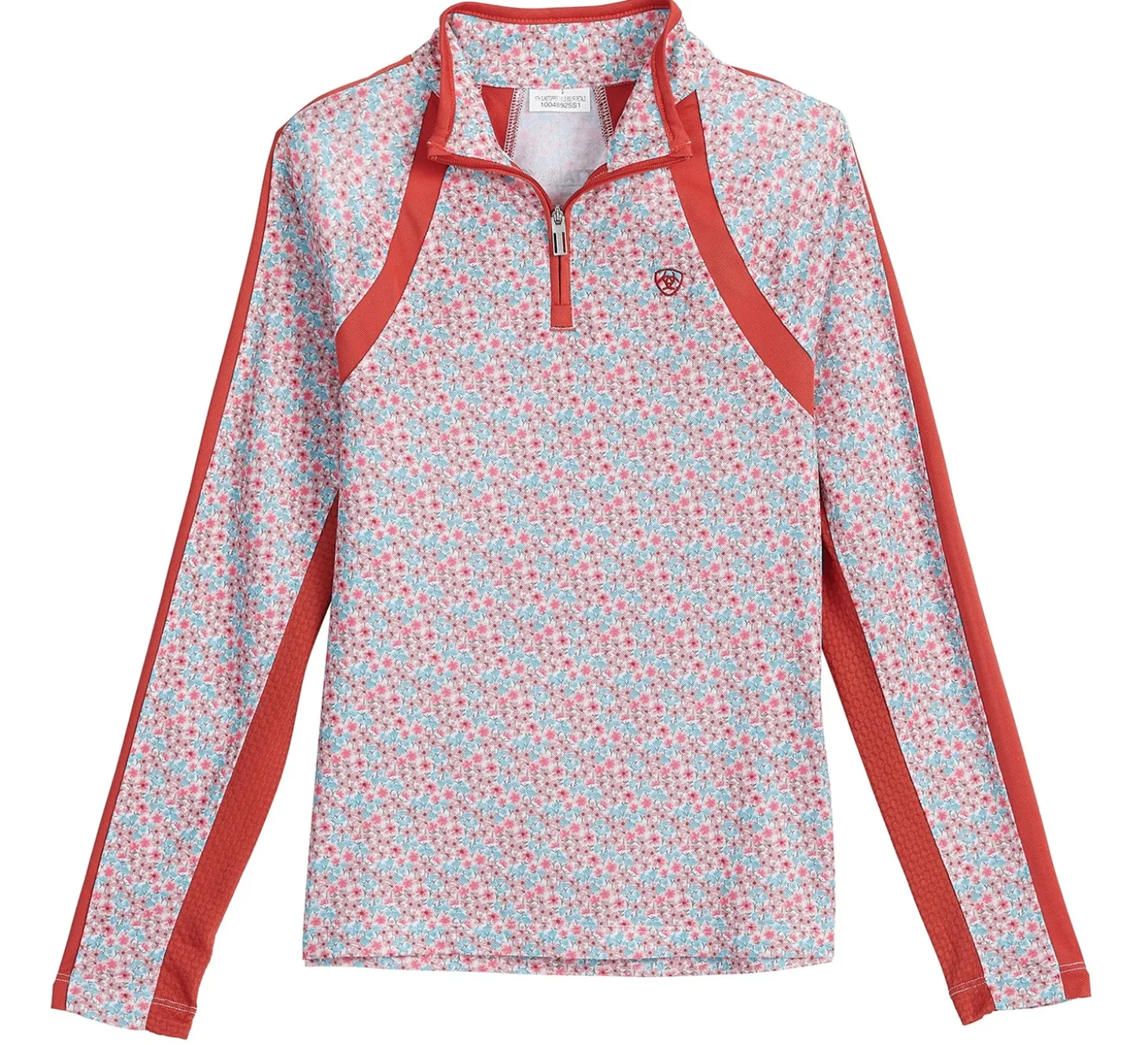 The Ariat® Kids’ Print Sunstopper Shirt 3.0 is a quarter-zip base layer riders can feel extra good about wearing! This updated version of a perennial favorite is made with a lightweight, recycled poly piqué knit in a lively print. Rated UPF 50, it helps shield skin from the sun. ClimateTek™ cooling technology and FreshTEK™ odor resistant technology work together to keep kids feeling fresh.