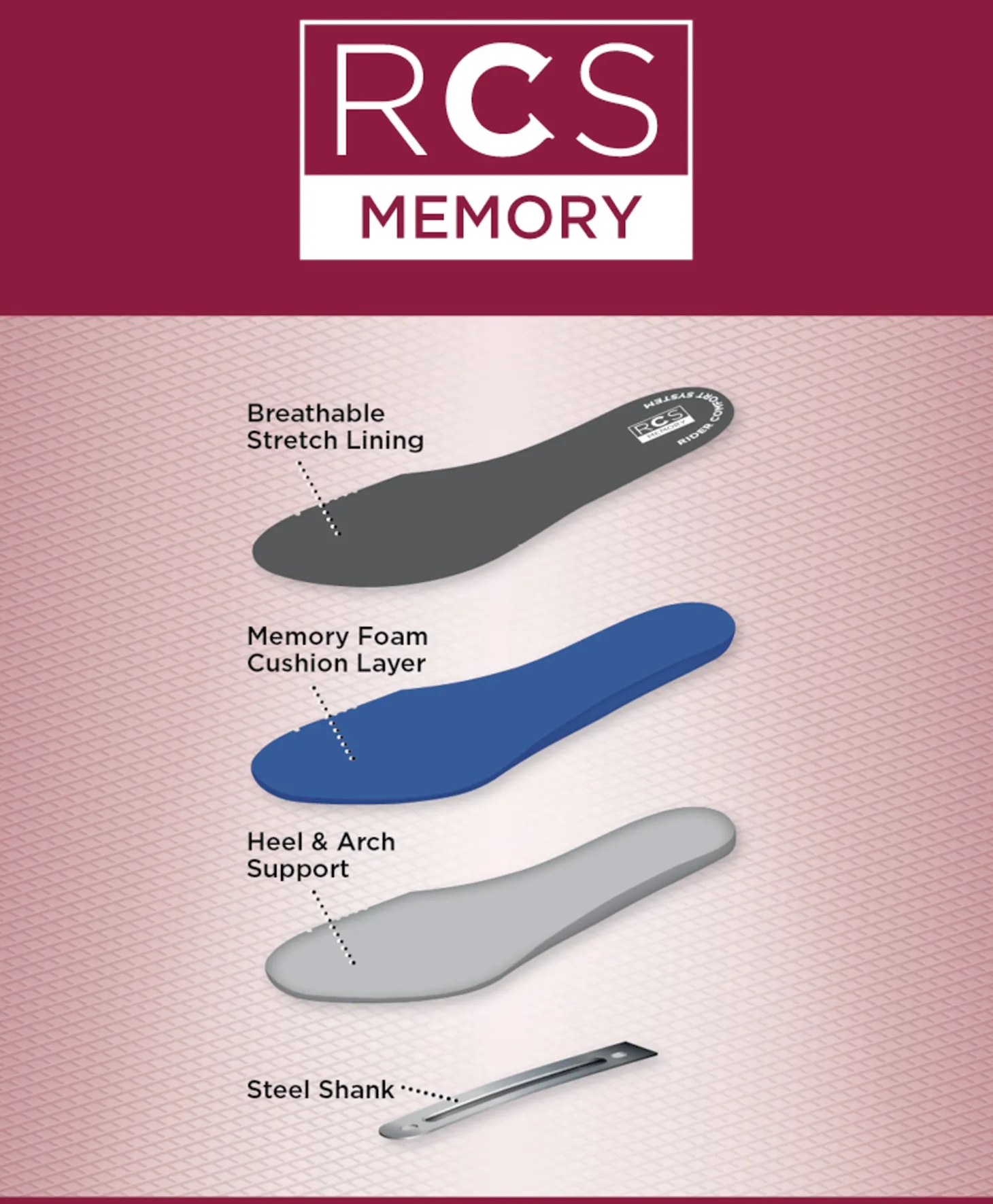 High arch and outsole with built-in shank offer lateral stability. Durable rubber outsole has flex point grooves to enhance comfort in and out of the stirrups.