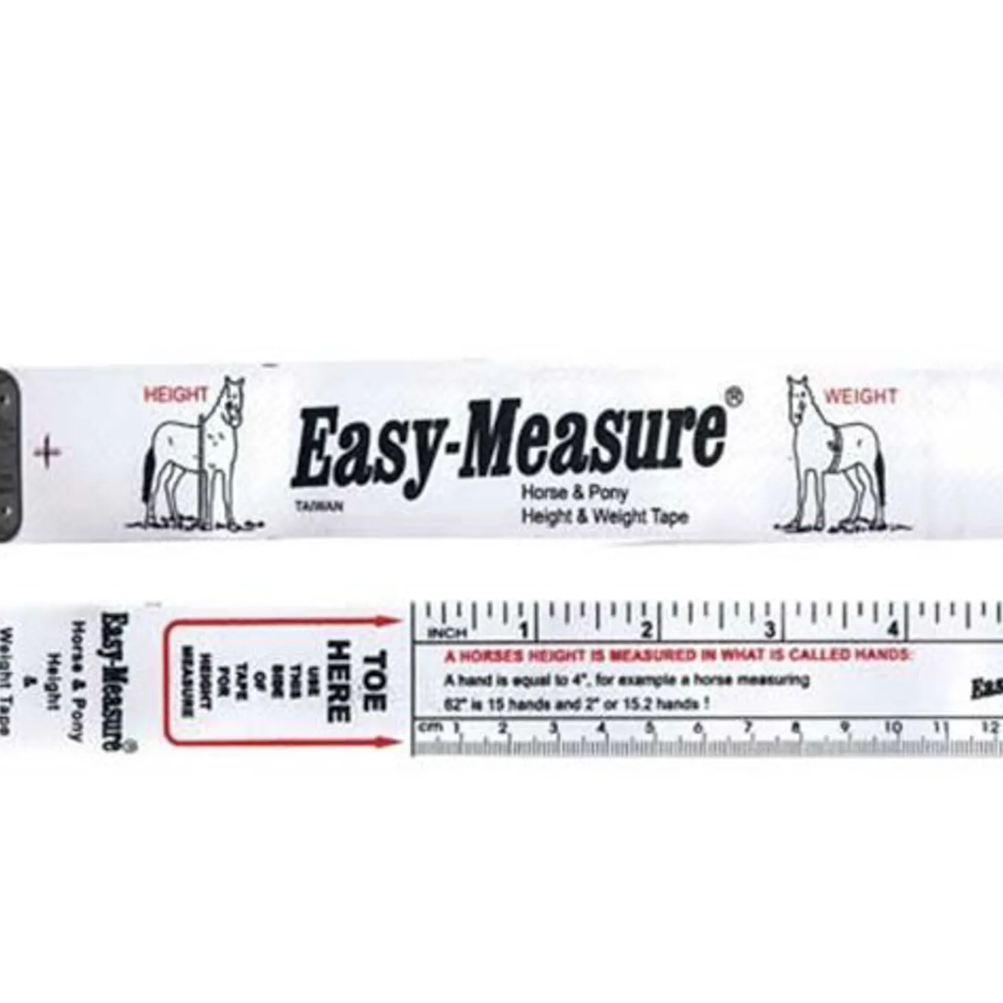 Easy Measure Height/Weight Tape for horses and ponies is made of vinyl-coated nylon. It measures height in both hands and centimeters and weight in both pounds and kilograms.