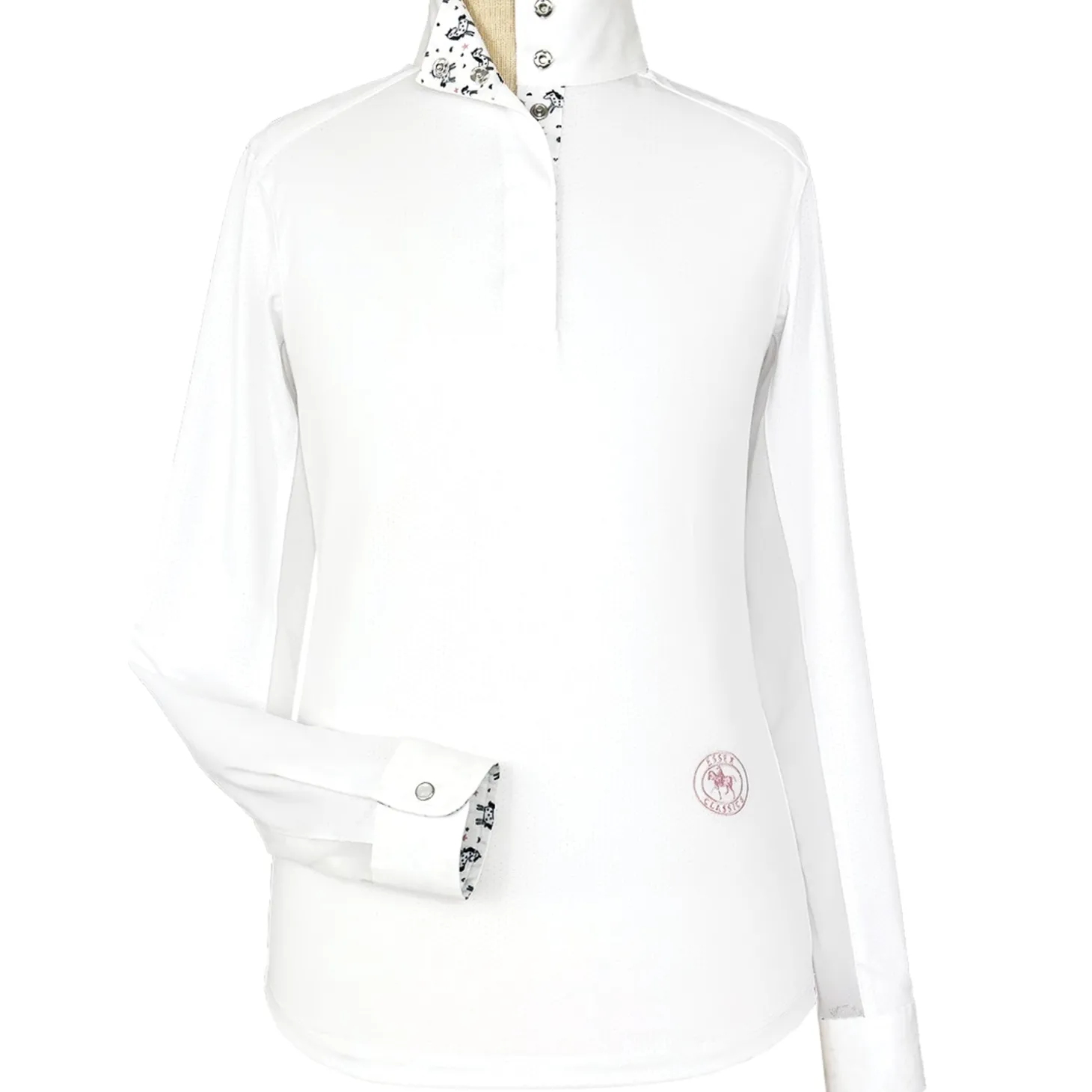 Essex Classics Girls’ Talent Yarn Long-Sleeve Show Shirt is tailored in easy pullover style with a gently tapered body fit for a neat appearance with or without your show coat. Unsnap the collar and turn back the cuffs to show our exclusive fabric trim. Smart, thermoregulating technology helps maintain an optimal body temperature. Moisture wicking and deodorizing antimicrobial properties provide quick dry and stay fresh benefits that never wash out. Stain resistance helps keep your shirt looking new wash after wash. Breathable, stretch Talent Yarn keeps you comfortable in the saddle all day and the tapered fit, tucks easily into breeches (and stays tucked!).