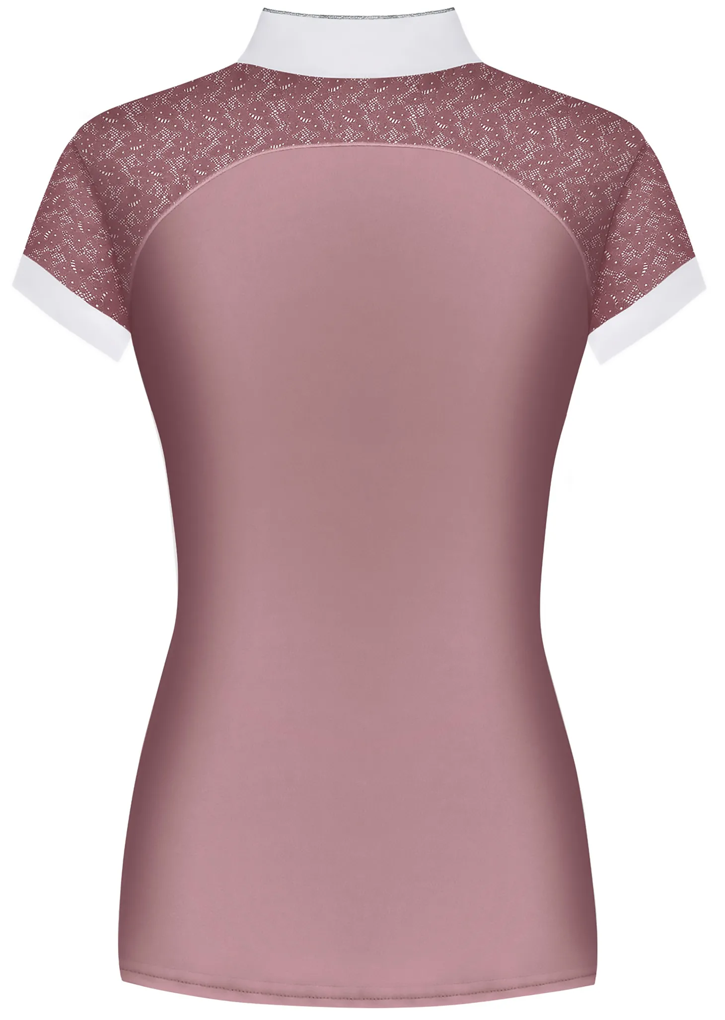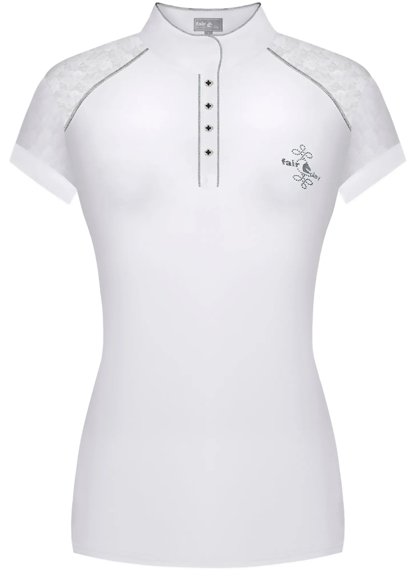Elastic lace on the sleeves and front and back shoulders is a feminine touch that also adds airflow. Shimmering piping trims the collar, four-button placket and front shoulders. This competition top is proudly made in Poland and suited for formal lessons and clinics as well as shows.