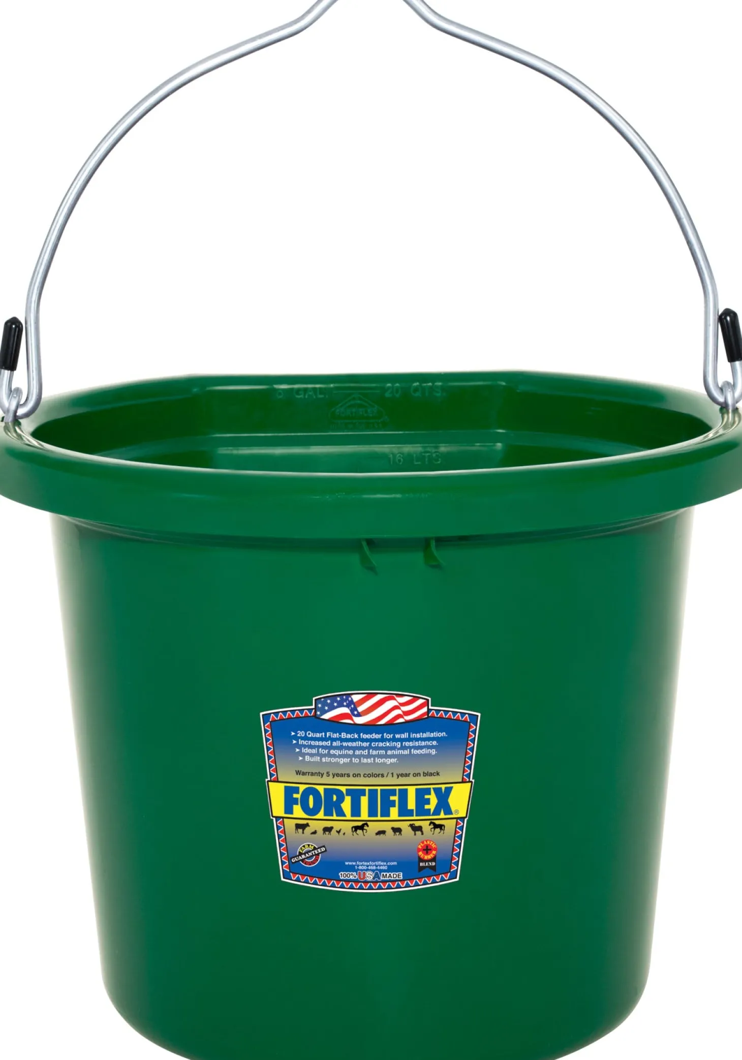 A favorite of many for watering or feeding horses, the Fortiflex® 20-Quart Flatback Bucket stands up to the daily rigors of the stable and barnyard—even in icy temperatures. It’s made of a food-grade, BPA-free Fortalloy rubber-polyethylene blend with heavy-duty galvanized fittings to resist cracking and breaking. The flat back design keeps it stable against a wall. Capacity markings in quarts, gallons and liters let you know exactly how much water your horse has consumed. Available in an array of colors to enhance your stable.