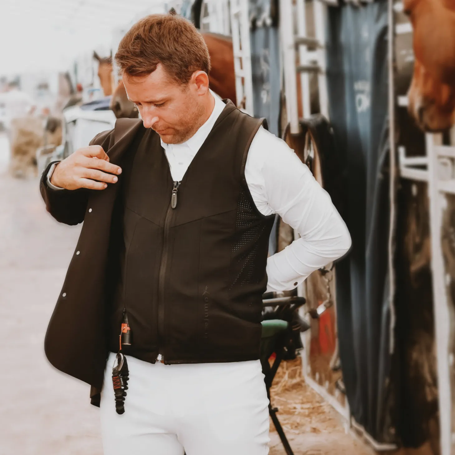 The Freejump Airbag is worn close to the body under a compatible jacket or can be worn over a thin layer of clothing, such as a T-shirt, show jacket or thin pullover. Compatible jackets bear the “Freejump Airbag Technology” badge. Each Airbag is tested individually.