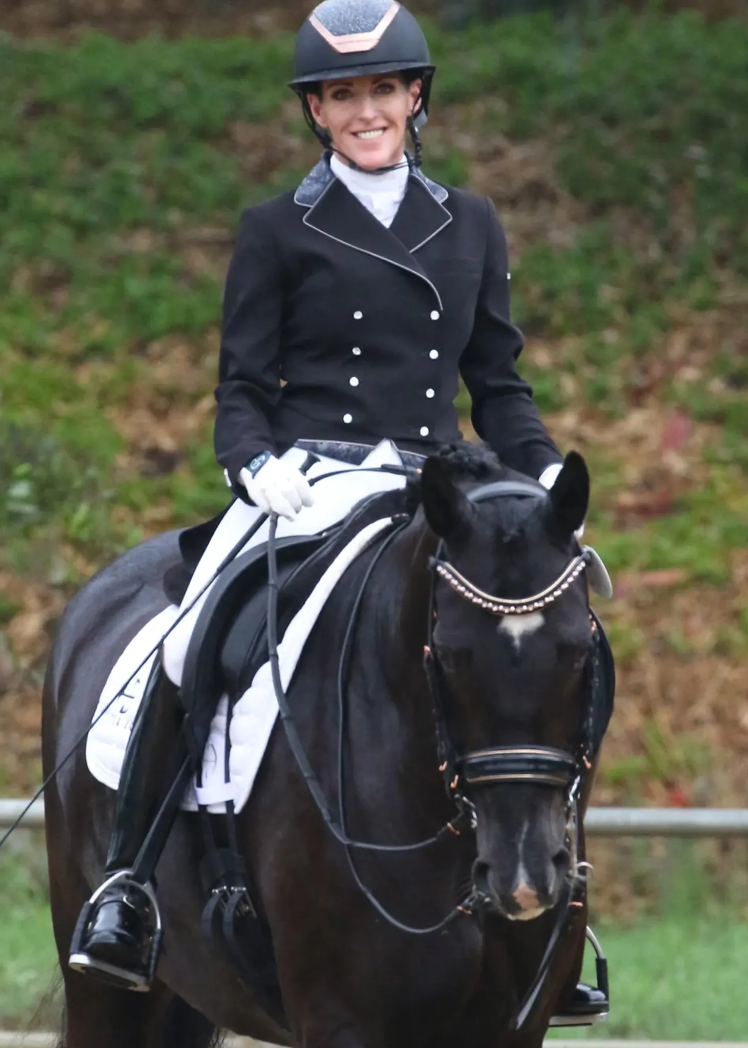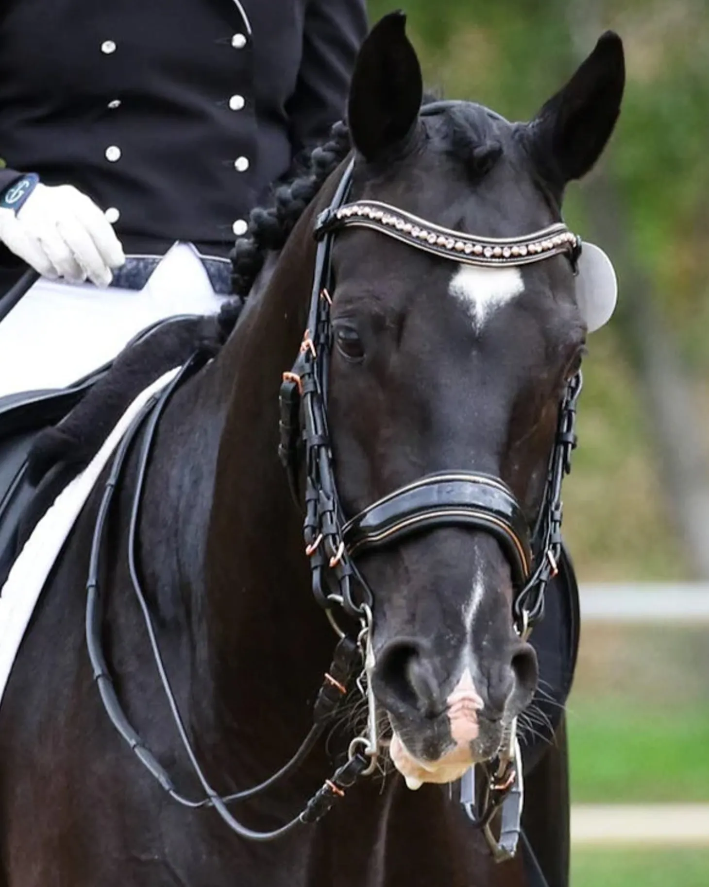 The best selling Halter Ego Aurelia Rose Gold Black Patent Double Bridle is simply stunning and perfect for rose gold fanatics! The black patent anatomical, crank noseband measures 2″ at the widest point. Plush black Nappa leather padding, flat leather and the padded, anatomical crownpiece alleviates poll pressure and provides ultimate comfort. Buckle cheekpieces with adjustable throat latch on both sides. Metallic Rose gold piping on noseband and browband, rose gold buckles and hardware, alternating rose gold crystal pearl cabochons and vintage rose crystal browband with rose gold piping and cupchain make this bridle exceptionally beautiful. This bridle comes with two sets of reins 56″ long; a curb rein with rose gold hardware, and a snaffle rein with a thin rubber grp lining and rose gold hardware.