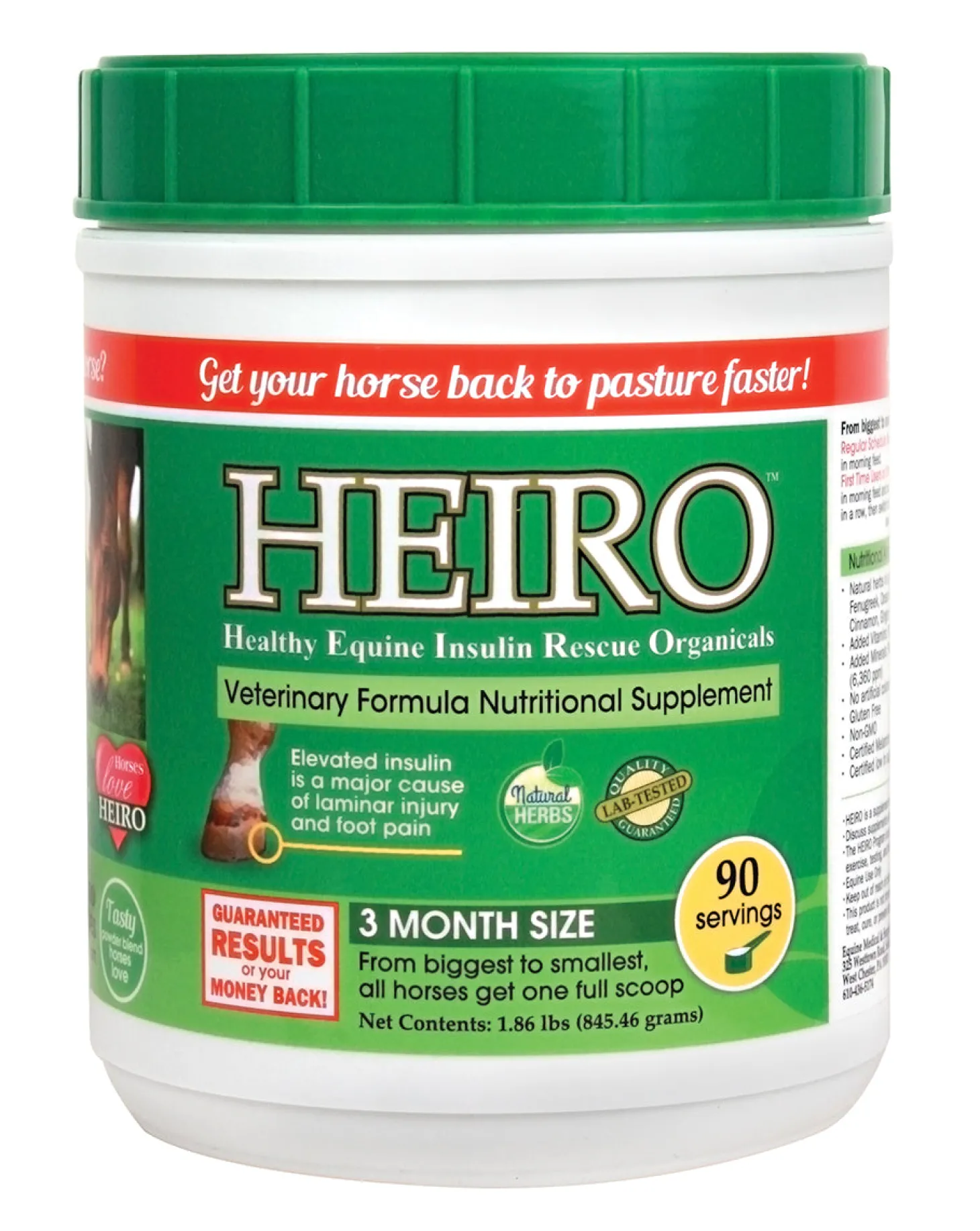 It helps fight laminar injury and stop foot pain caused by seasonal factors including new spring grass, summer heat, frosty fall grass and hard, frozen winter ground. If your horse has chronic sore feet, laminitis, elevated insulin levels, rotation shown by x-ray, cresty neck, takes Cushing’s medications, remains large even on little food, has a history of founder or can’t be on pasture, consider Heiro Healthy Equine Insulin Rescue Organical. Feed 1 tablespoon daily in morning rations; measuring scoop included. 90-day supply.