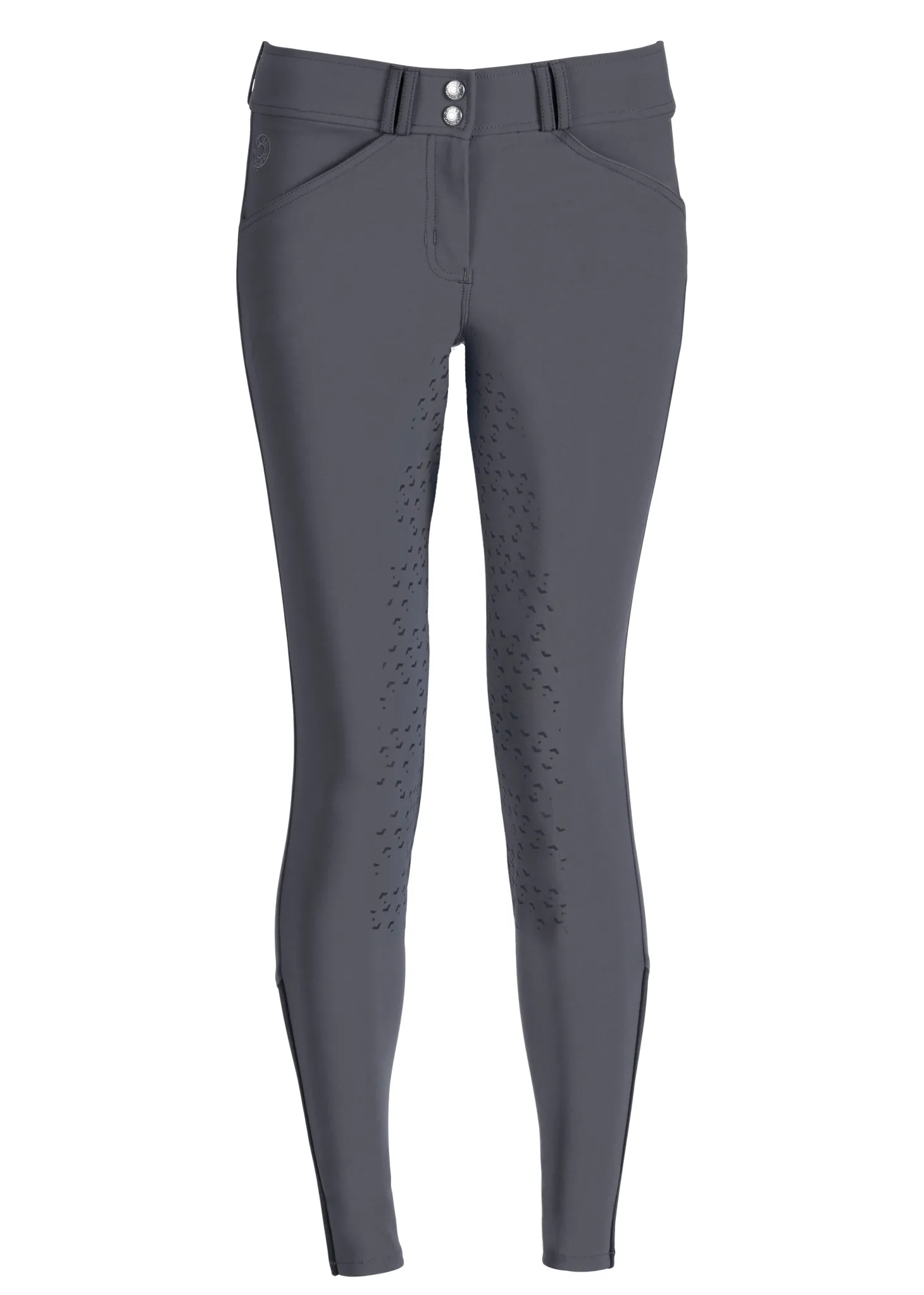 Single-layer, high-stretch calf panels provide a custom fit, eliminate bulk inside boots and allow easy on/off. Front slash pockets and functional back pockets are made of low-profile stretch material for a no-show appearance on the outside and enhanced comfort on the inside. The silicone print full seat features a stylish equestrian design that provides flexible grip.