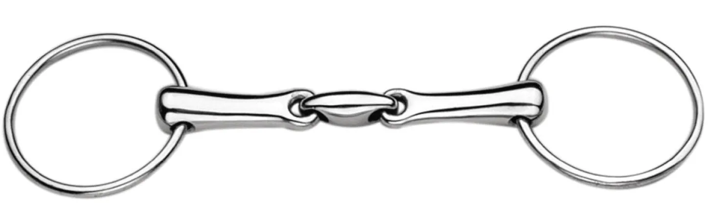 The Korsteel® Oval Link Loose Ring Bit features a smooth center piece that lies across the horse’s tongue. Designed to eliminate or reduce interference with the horse’s palate and to reduce the nutcracker effect of a single-jointed snaffle, this affordable double-jointed loose ring is made of stainless steel. 20mm mouht; 70mm rings.