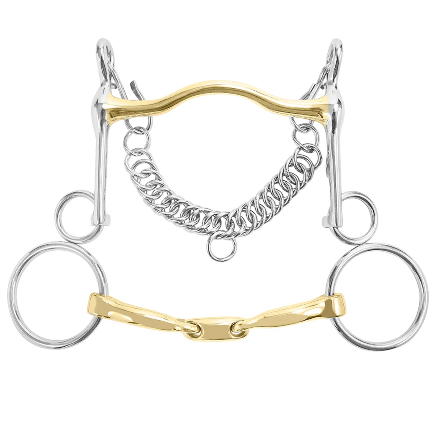 The longer shanks on the curb create a slower response with more leverage as compared to a shorter shank curb. Mouthpiece is 12mm thick; shanks are 7cm long. Curb chain is included. The bradoon has a 14mm mouthpiece and 55mm loose rings.