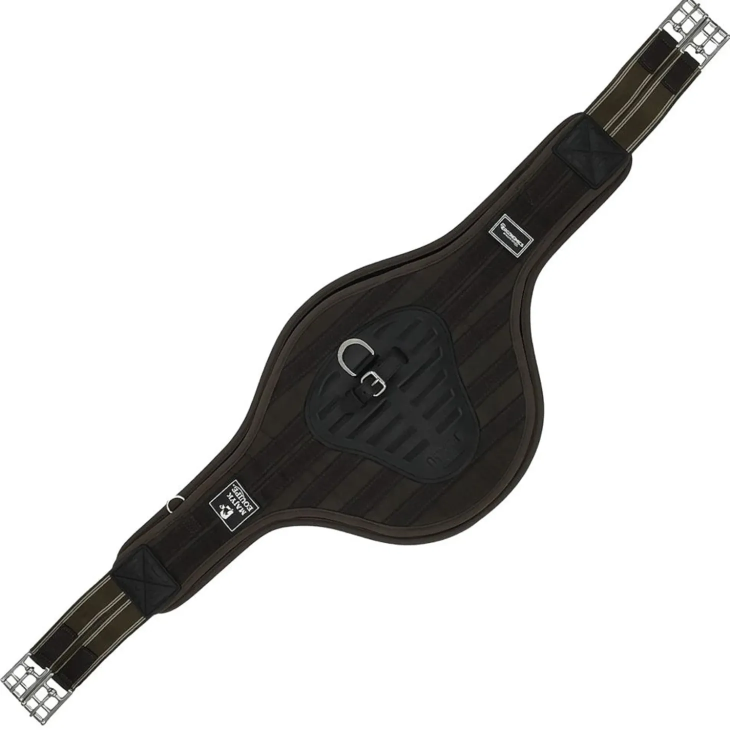 This girth features a stabilizing, protective center plate. D-ring can be used with training aids; buckle attachment for a martingale. Stainless steel buckles and elastic fittings allow a range of adjustments.