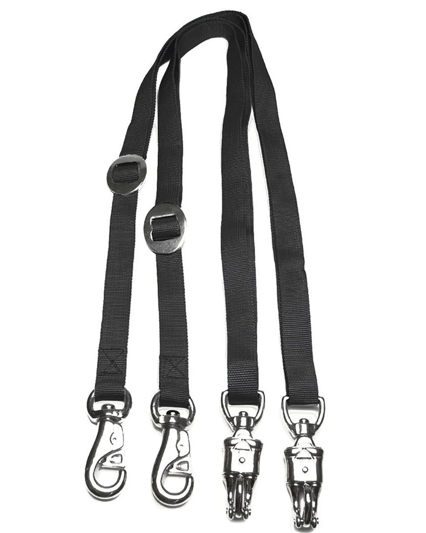These Nylon Web Cross Ties are made of 1″ wide heavy-duty poly web with bull snap and panic snap ends. Adjusts from 40″ to 84″ long. Set of 2.