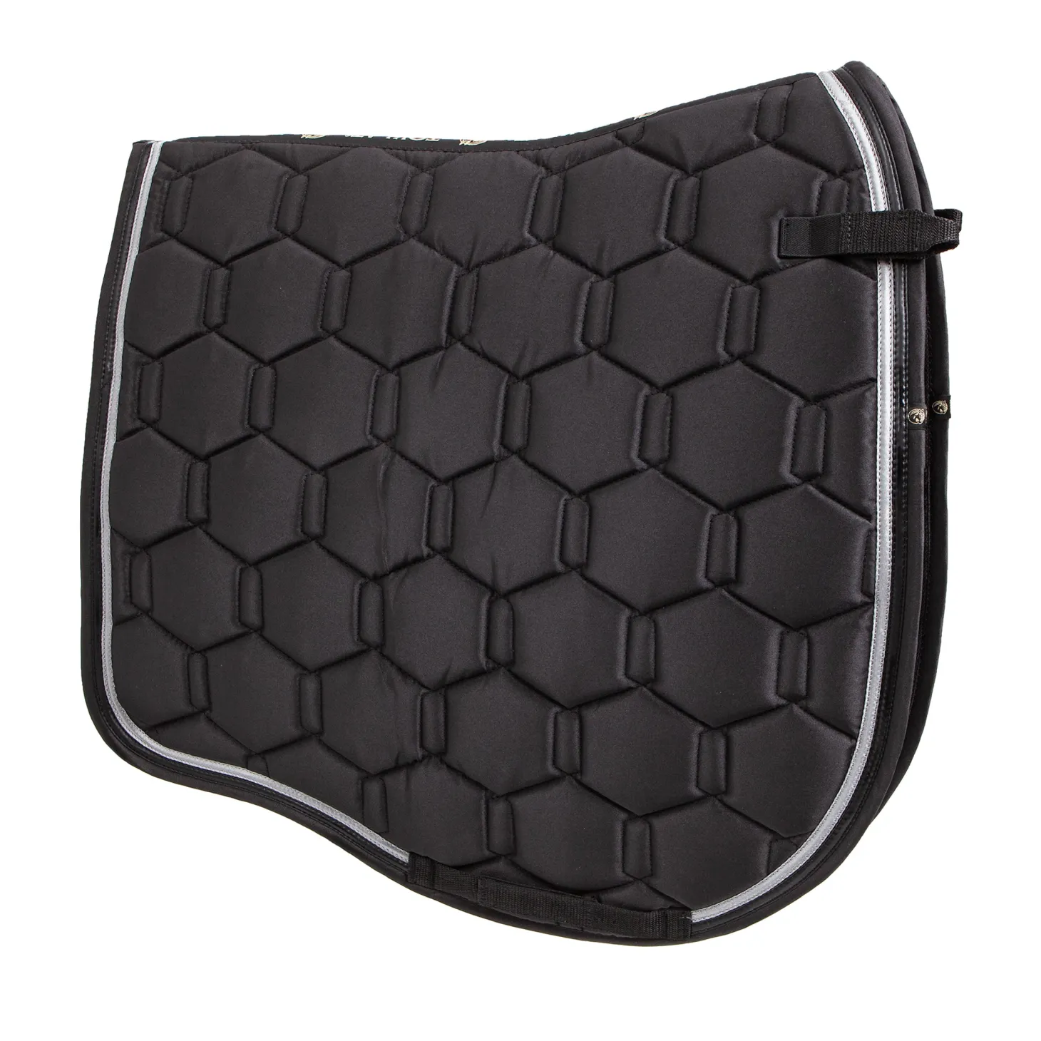 The Toklat® Tango Double Hexagon Dressage Pad is a stylish partner to most dressage saddles. Made with a satin twill top with faux leather and twill trim, it provides a stylish and refined look. The quick-dry lining offers moisture management, while extra fill creates a lofty and comfortable amount of padding. Hook-and-loop d-ring and girth straps for security.